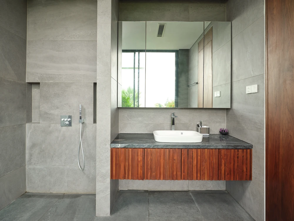 Để mang lại sự thông thoáng, giảm bớt nhiệt độ cho ngôi nhà, kiến trúc sư đã sử dụng ba tầng lọc nhiệt độ đến từ mảng xanh, nước và hình khối kiến trúc.