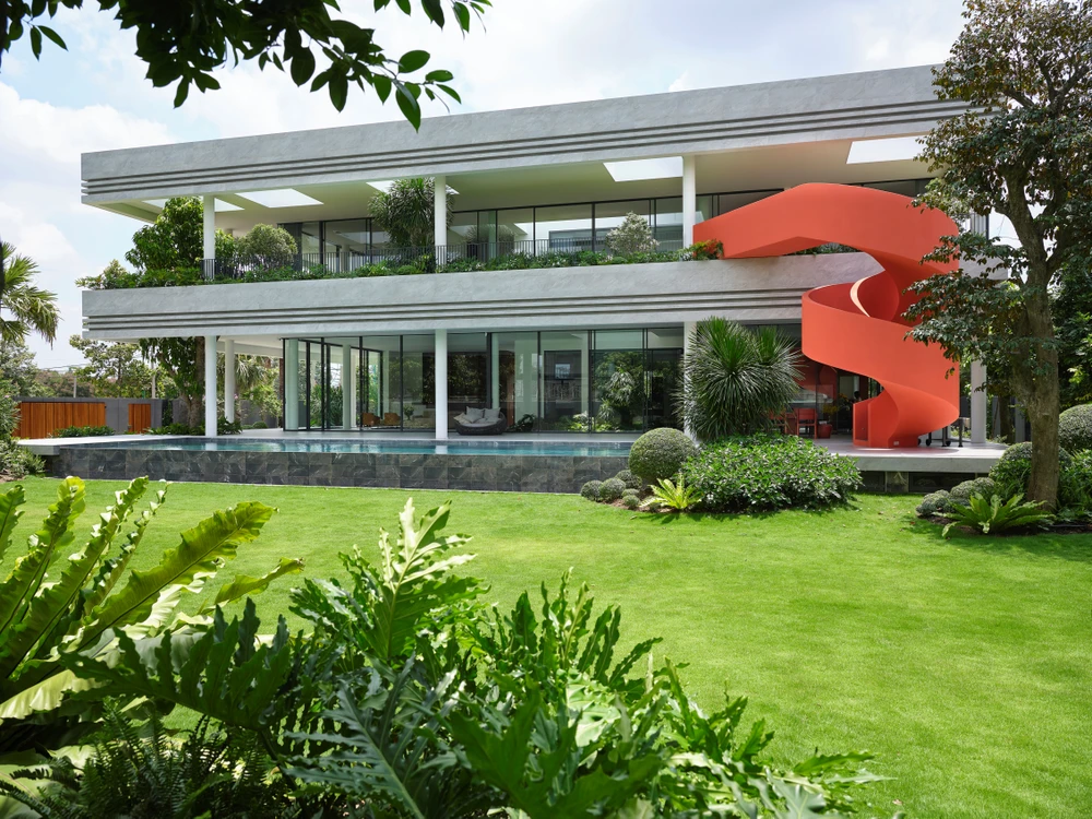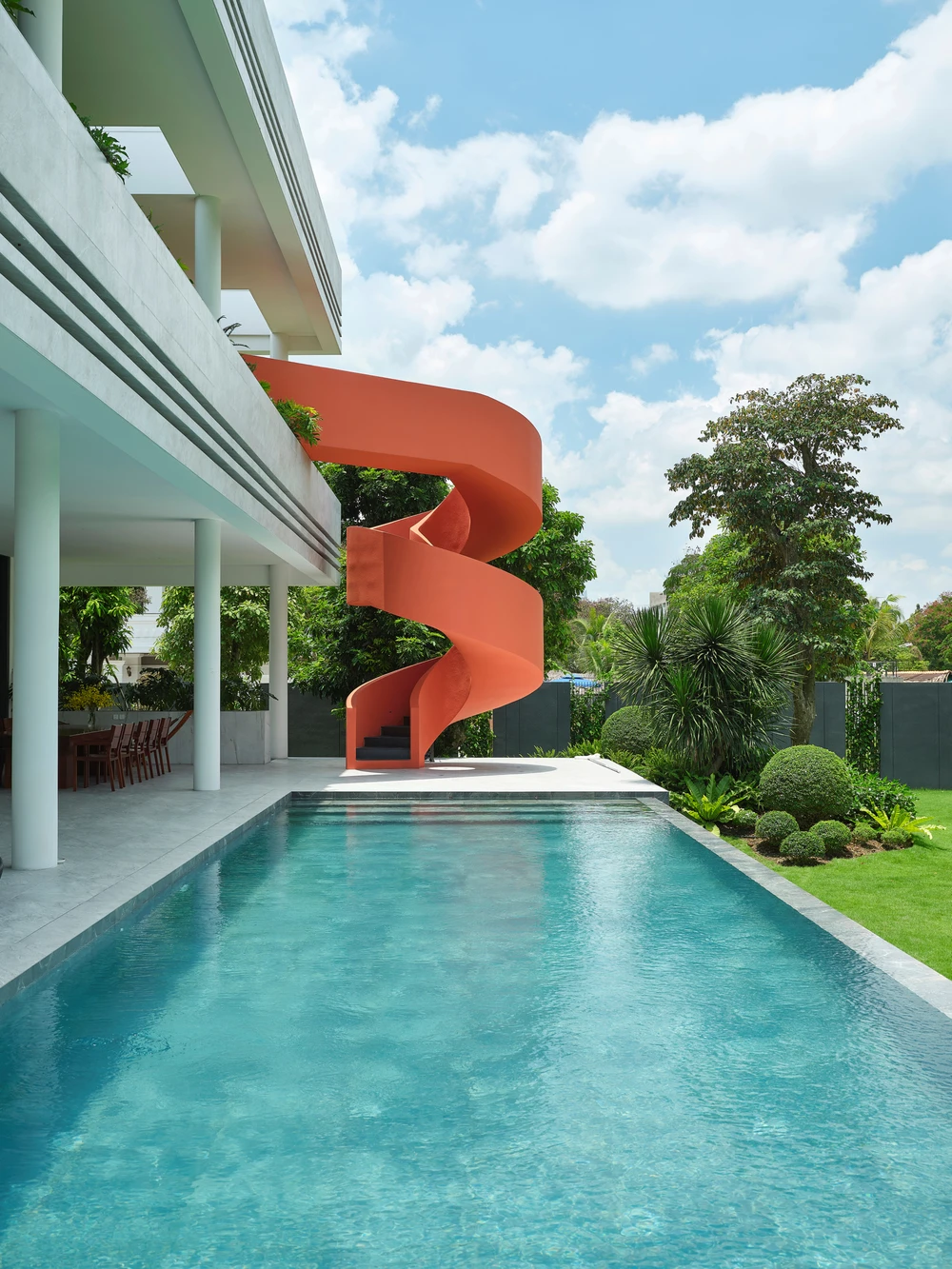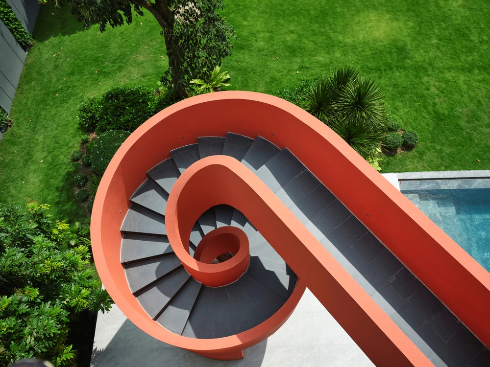 Nhìn từ bên ngoài, chiếc cầu thang xoắn ốc bên hông ngôi nhà với màu cam rực rỡ trở thành điểm nhấn đặc biệt.