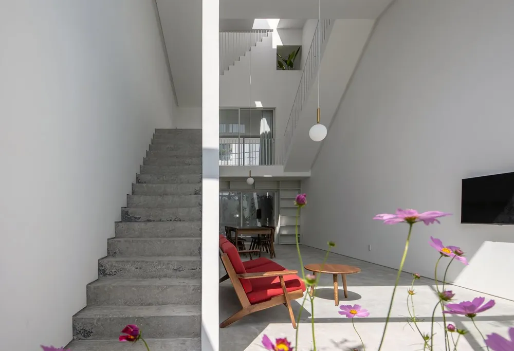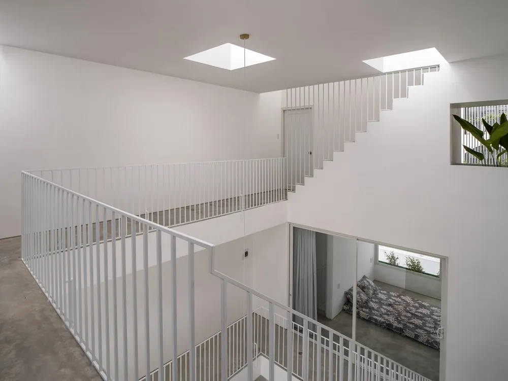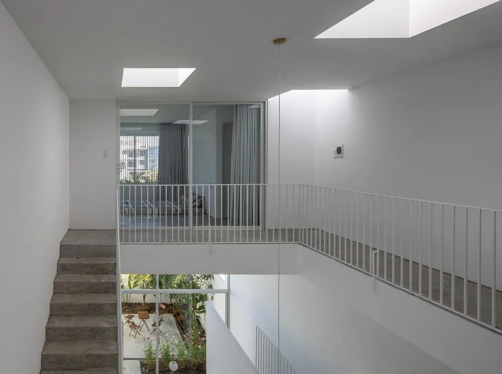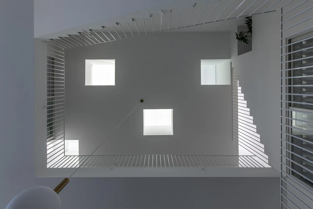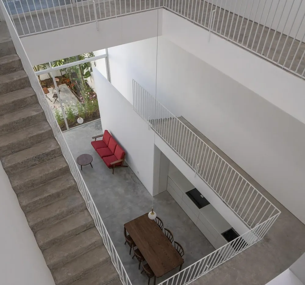 Lối giao thông trong nhà theo hình xoắn ốc xung quanh giếng trời, kết nối phần còn lại của các không gian nhà.