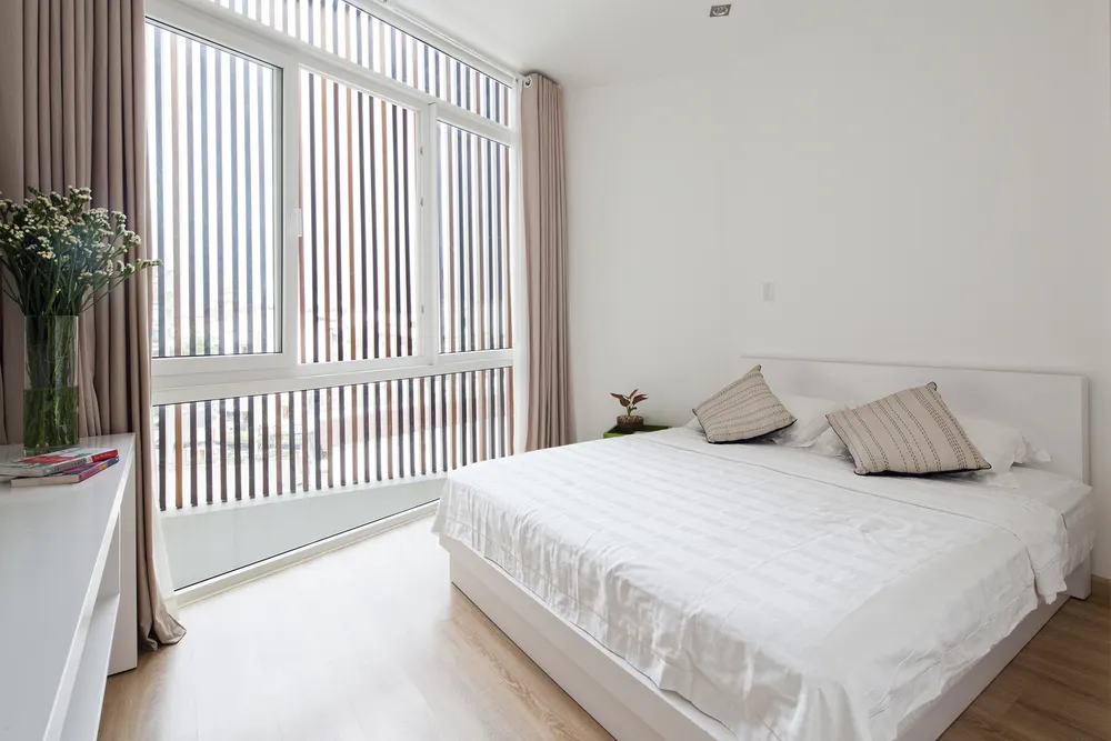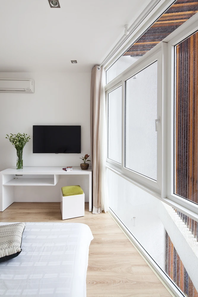 Phòng có tông màu chủ đạo là trắng với phần ván lót sàn màu nâu nhạt tạo cảm giác thư giãn. Phòng có một cửa sổ lớn, bên ngoài vẫn là các thanh lam dọc bằng gỗ giúp đón nắng vào phòng.