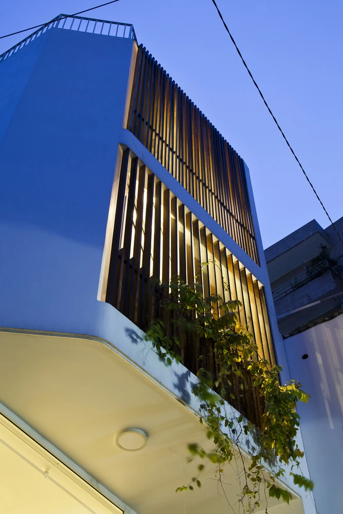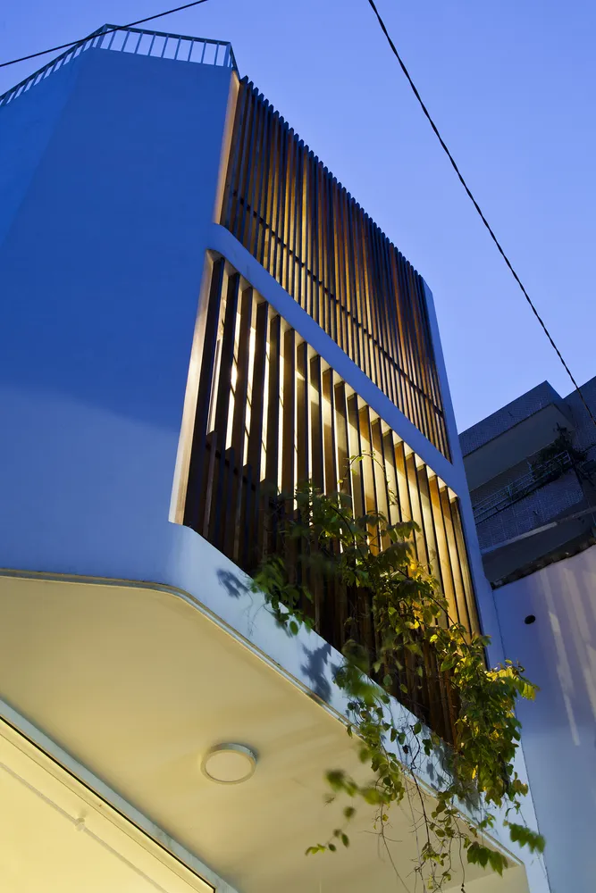 Dọc lối vào là phần mái che gồm những thanh gỗ xếp song song nhau, vừa có chức năng cản bớt nắng, vừa giúp tạo điểm nhấn cho mặt tiền.
