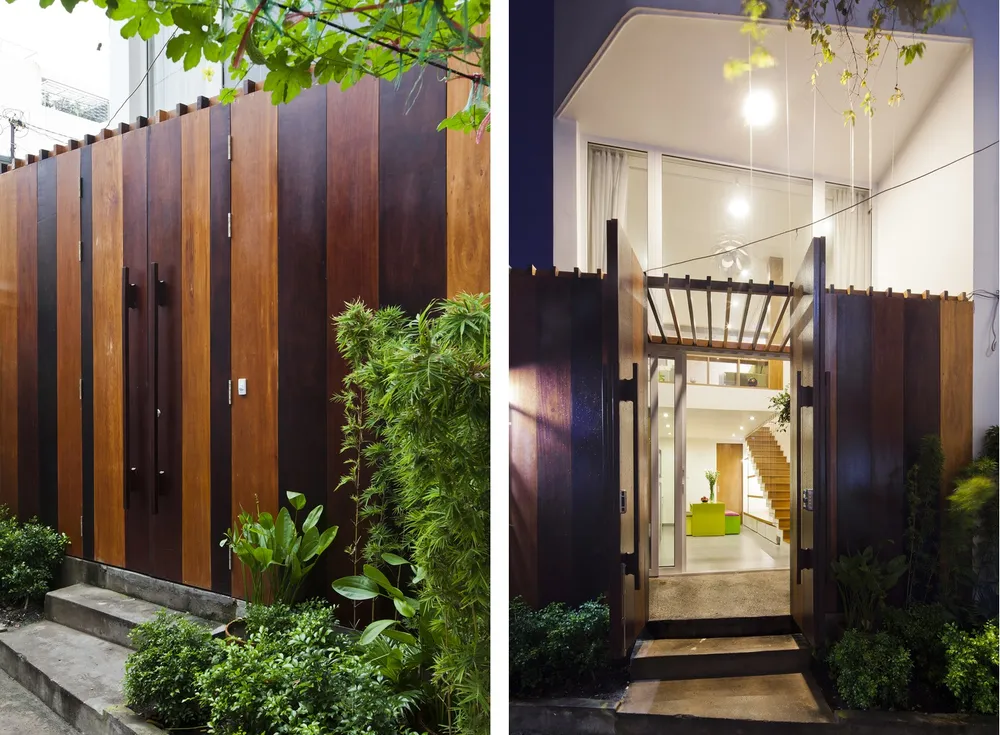 Cánh cửa cổng độc đáo làm từ gỗ với nhiều tông màu nâu khác nhau. Trước cửa, kiến trúc sư đã bố trí thêm các khoảng không để trồng cây xanh.
