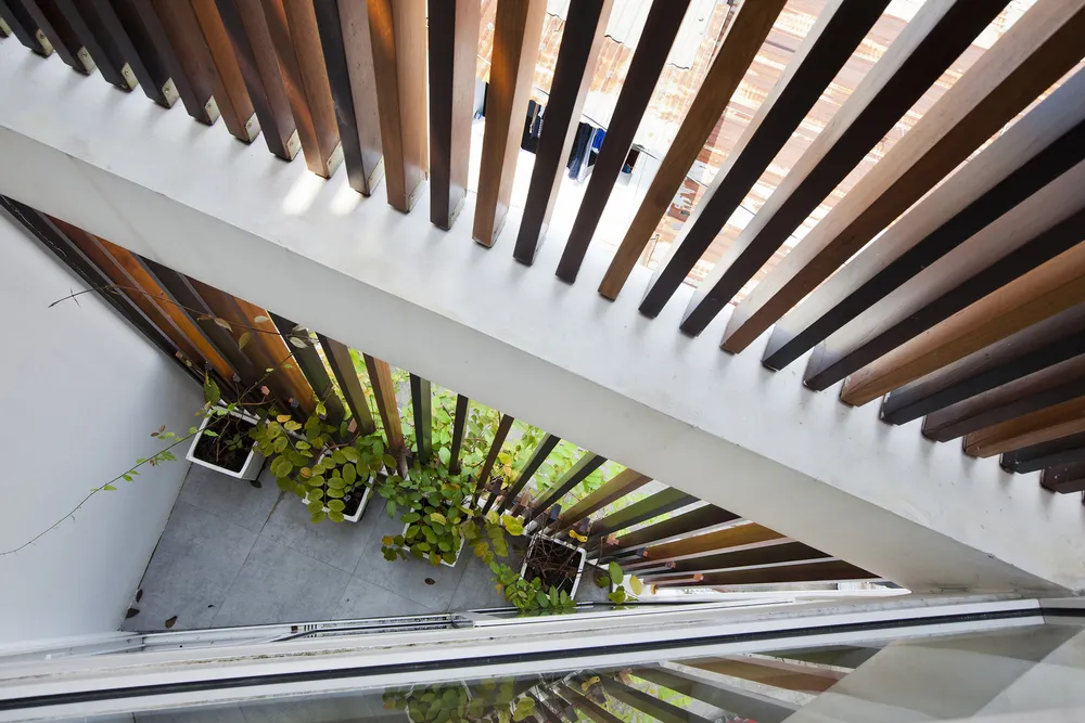 Khu vực này sẽ thông với tầng hai và được bao bọc bởi các thanh lam dọc bằng gỗ, vừa có tác dụng điều hòa ánh nắng, vừa giúp tạo điểm nhấn cho ngôi nhà.