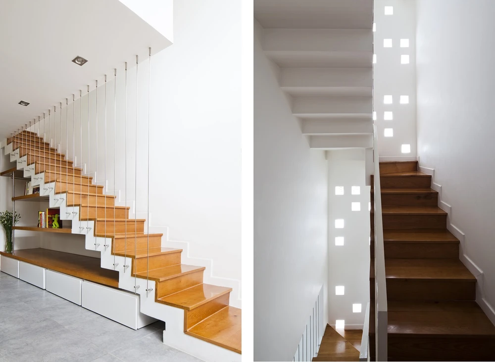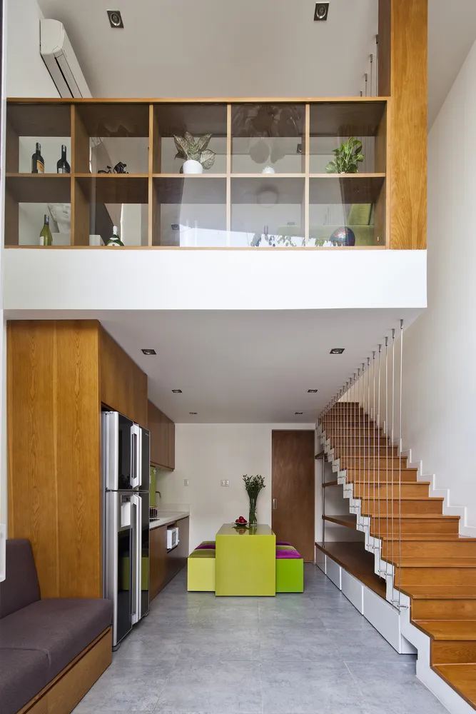 Cầu thang dẫn lên tầng lửng được bố trí phía bên phải phòng ăn. Không gian dưới cầu thang được các kiến trúc sư tận dụng để làm kệ để sách. Sau nhà bếp là một nhà vệ sinh.