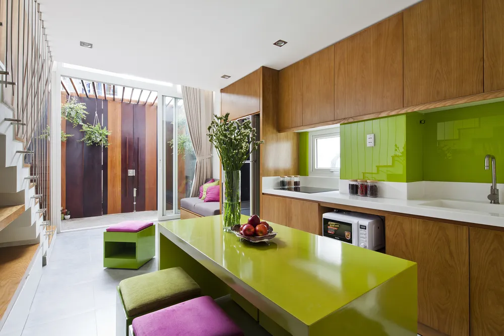 Bàn ăn cũng có màu xanh nhưng được điểm thêm bộ ghế xanh, hồng, giúp tạo cảm giác trẻ trung cho ngôi nhà ngay từ khi vừa mới bước vào.