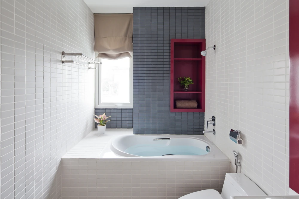 Nhà vệ sinh kết hợp nhà tắm với một bồn tắm cỡ vừa nằm ở góc. Tô điểm cho không gian này là những chiếc tủ màu hồng đậm được treo trên tường