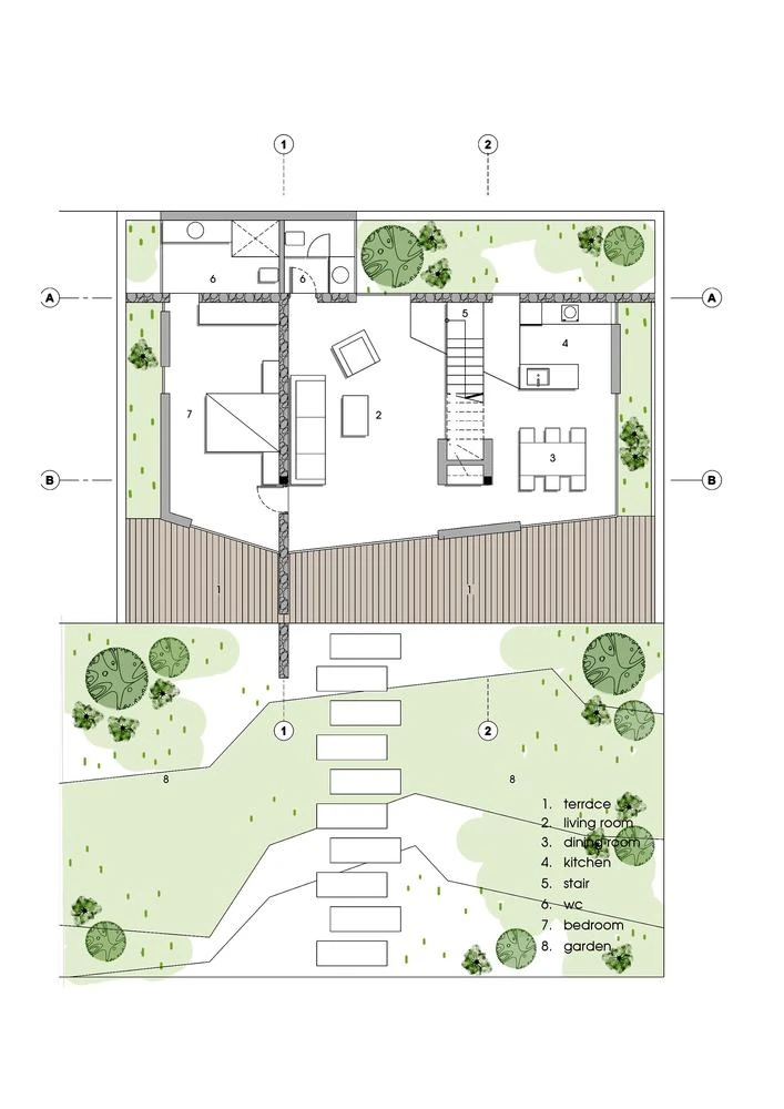 Folded Roof House có diện tích 120 m², bao bọc bởi cây xanh của sân vườn. |