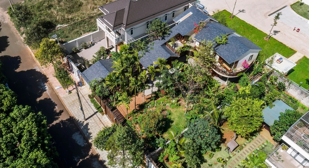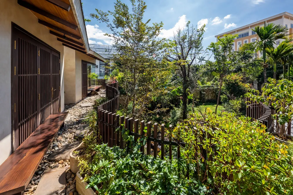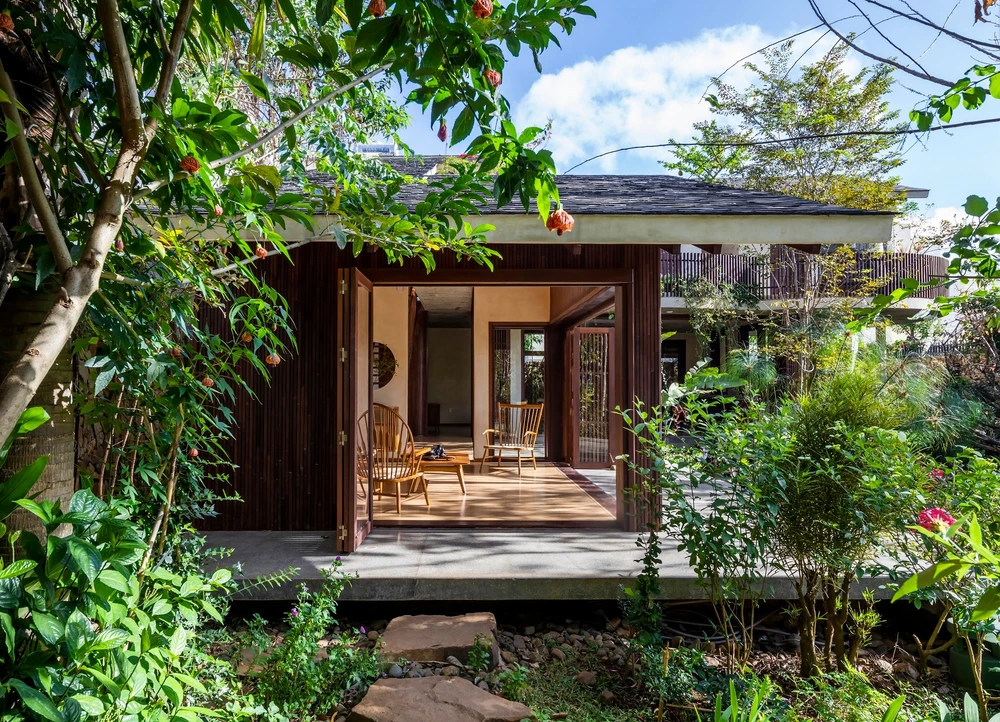 Khu vườn xanh mướt xung quanh nhà, giúp điều hòa không khí, giảm khói bụi và ánh nắng trực tiếp vào nhà.