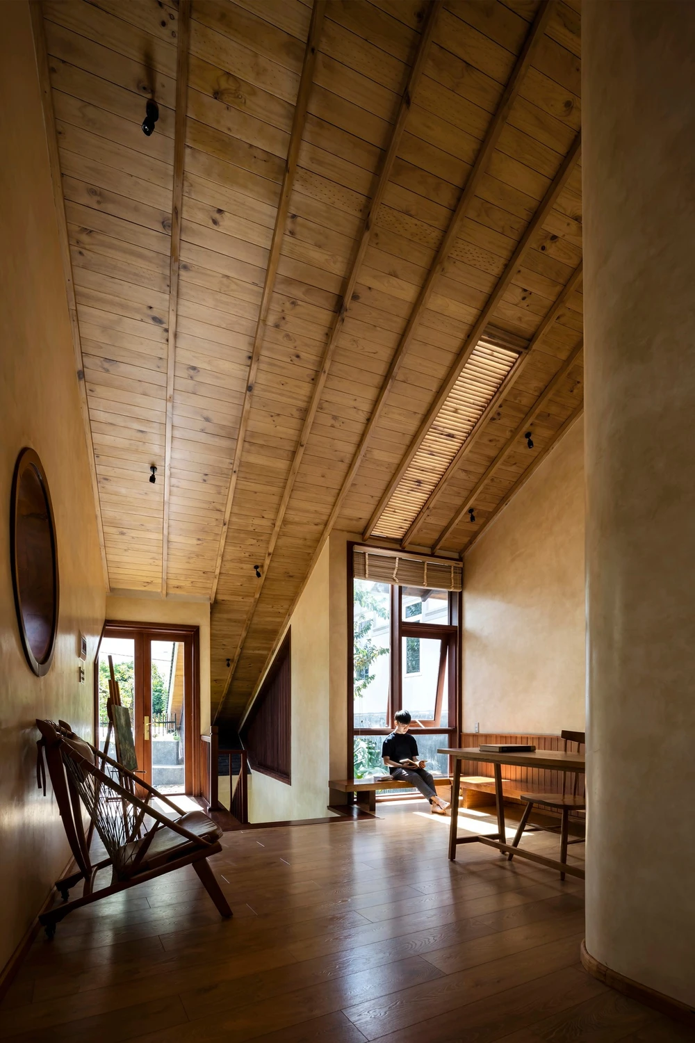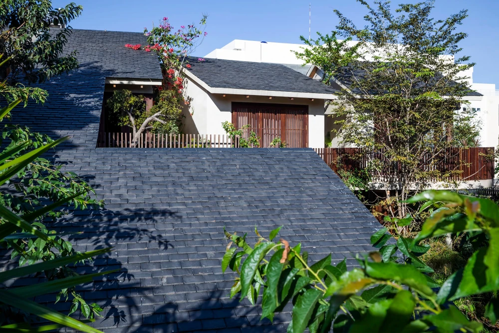 Các không gian riêng tư được bố trí xen kẽ bởi các khoảng cây xanh, nhìn từ xa hệ mái tạo nên một nhịp điệu trùng điệp, tự do song đầy vững chãi.