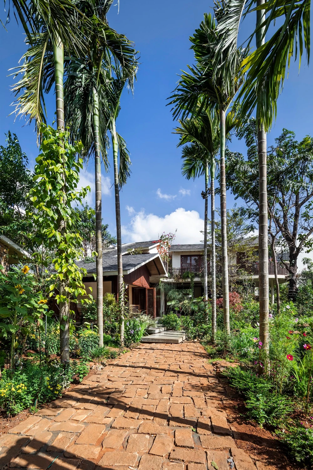 Lối vào nhà được trồng nhiều hoa và hàng cau.