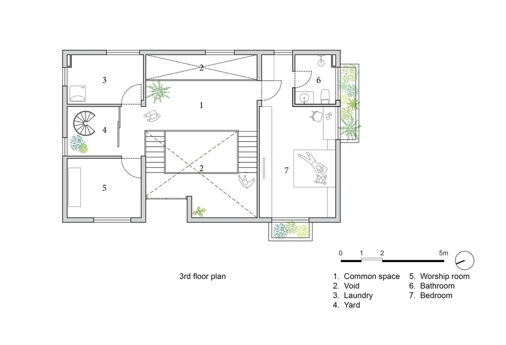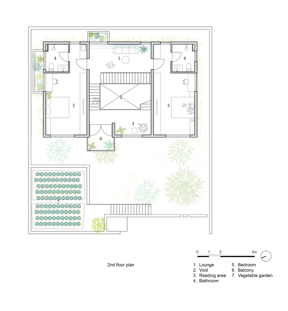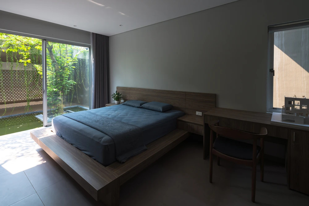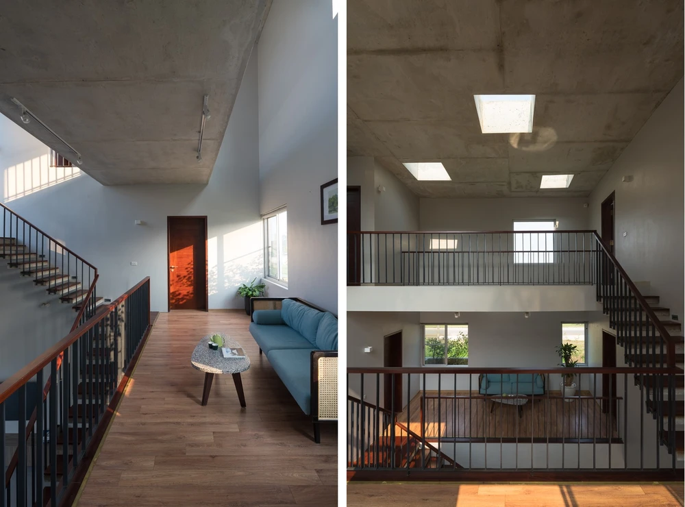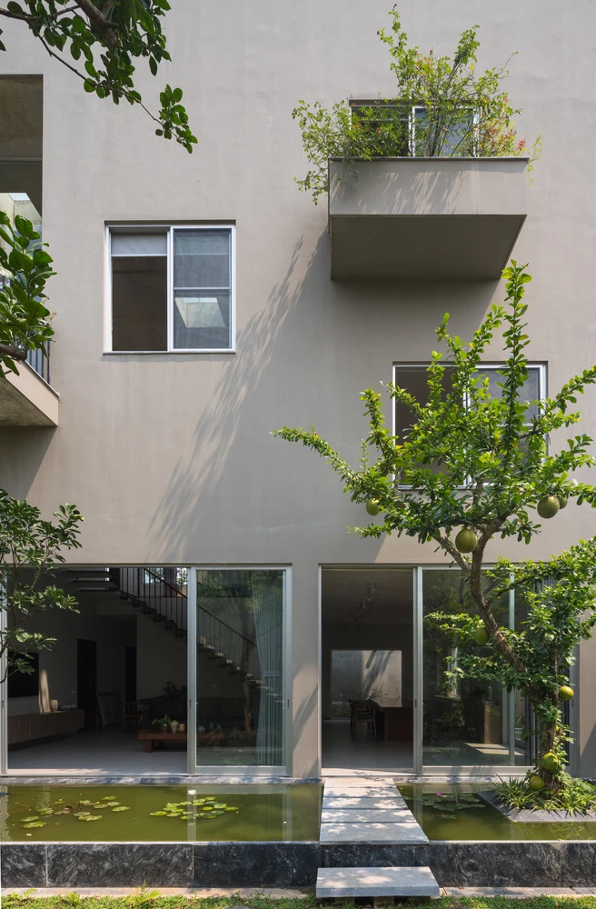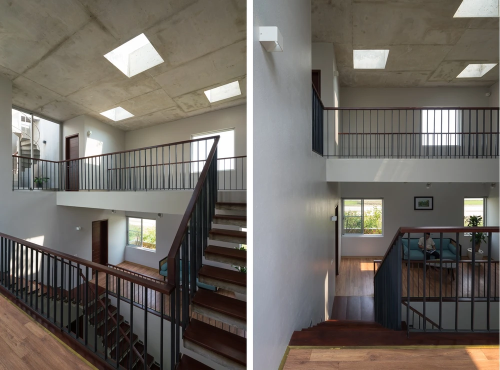 Hai khối khác của ngôi nhà bao gồm phòng ngủ và các phòng chức năng khác. Cửa sổ với ban công cây xanh được đặt cẩn thận trong các phòng đó để cung cấp đủ ánh sáng, không khí và tầm nhìn thú vị.