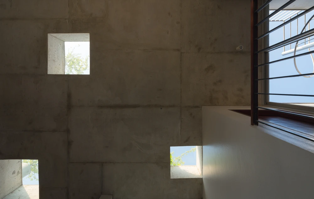 Các khe hở ở cả mặt tiền và tầng thượng được đưa vào theo kiểu ngẫu nhiên, tạo nguồn ánh sáng vào bên trong nhà.