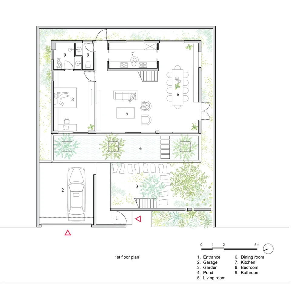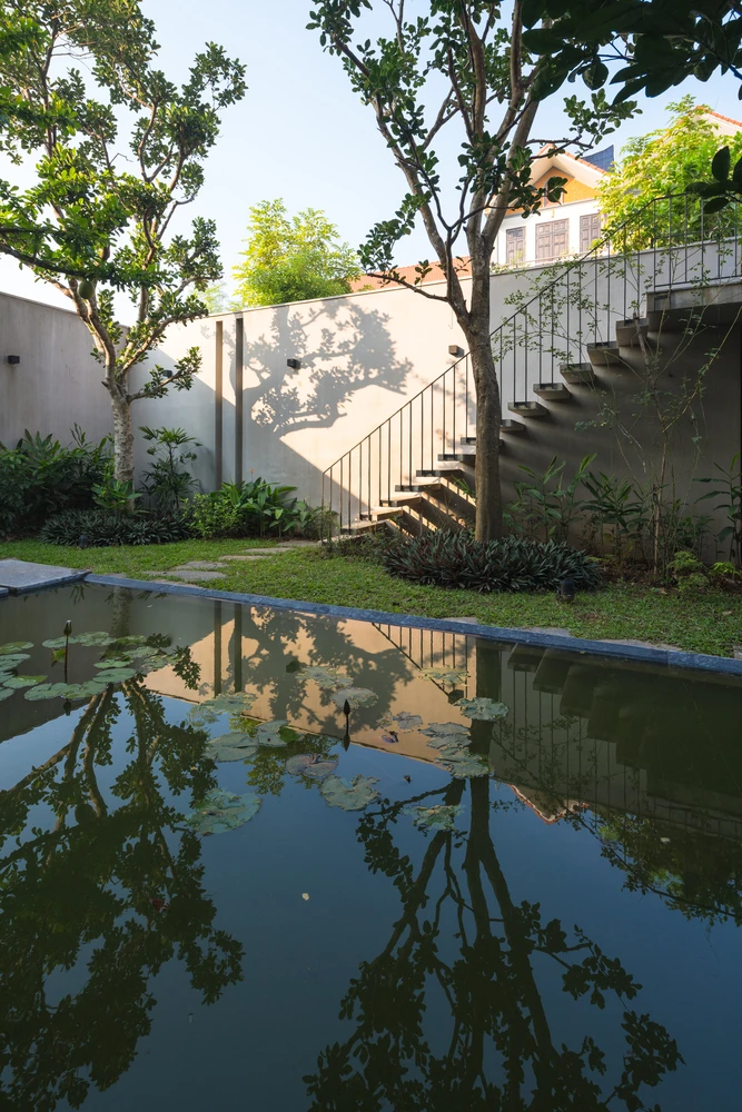 Hồ cá, cây cao và cầu thang dẫn lên vườn rau trên nóc gara không chỉ làm cho cảnh quan sân vườn trở nên sống động mà còn giúp lọc ánh nắng và không khí hướng tây vào bên trong nhà.