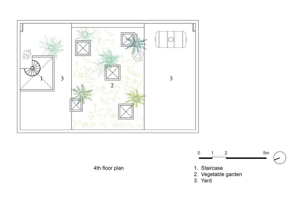 Từ sân ngoài trời ở tầng ba, cầu thang xoắn ốc dẫn lên khu vườn trên sân thượng vừa có thể nhìn ra cảnh quan thành phố, vừa cung cấp rau cho gia đình.