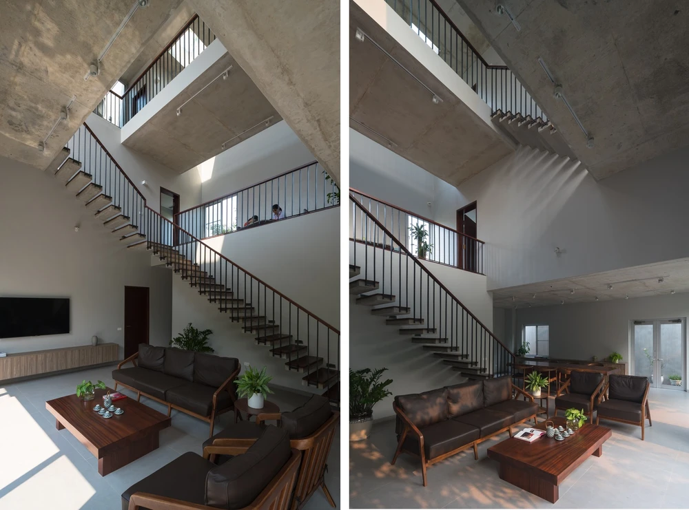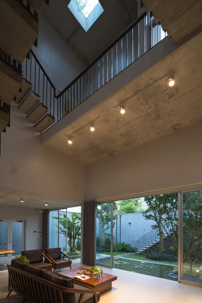 Khi bước vào nhà qua khu vườn và ao nước, một không gian rộng lớn sẽ mở ra. Tất cả các không gian chung đều nằm trong giếng trời ba tầng này ở trung tâm của nhà.