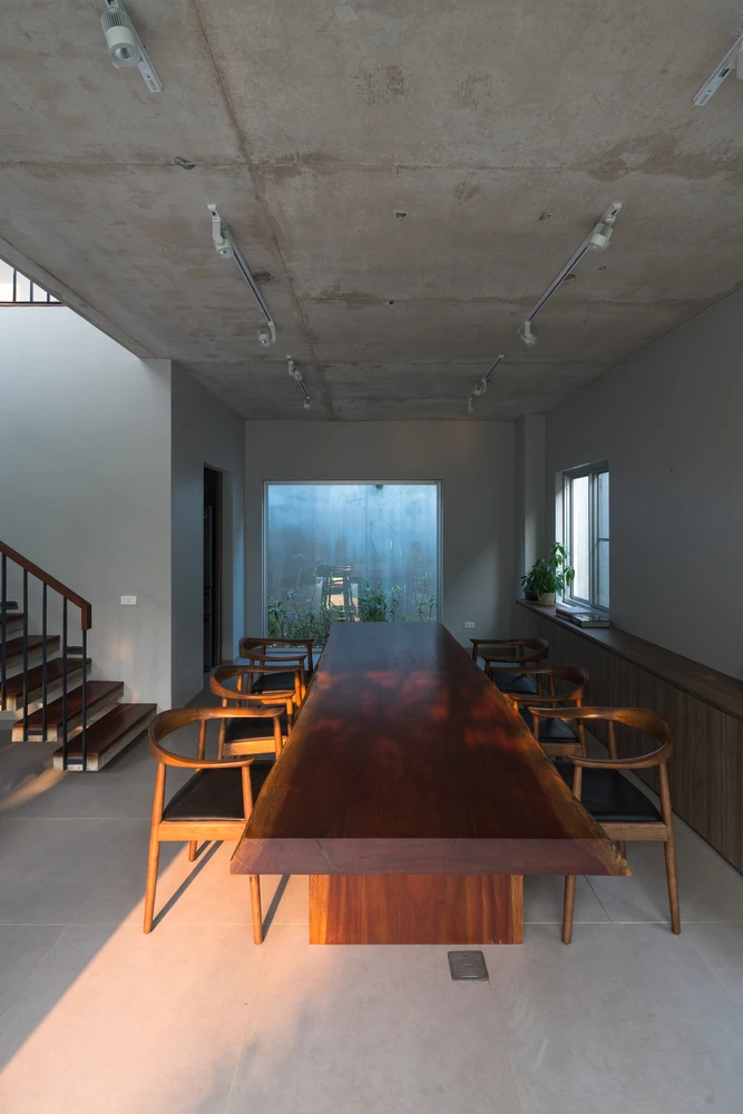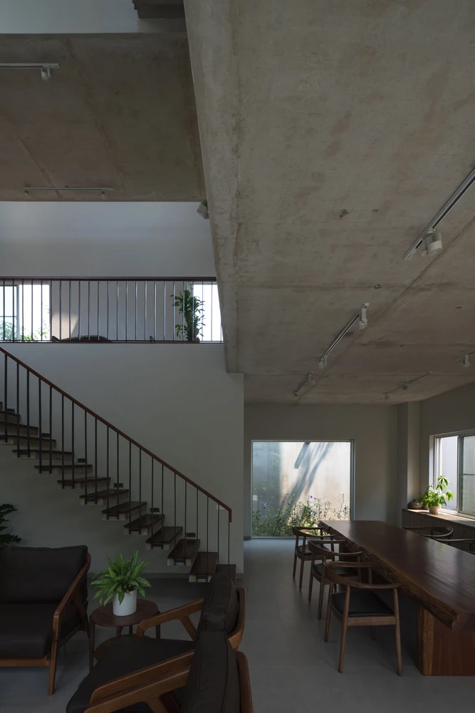 Vật liệu hoàn thiện nội thất bao gồm trần bê tông chưa hoàn thiện và đồ nội thất bằng gỗ.