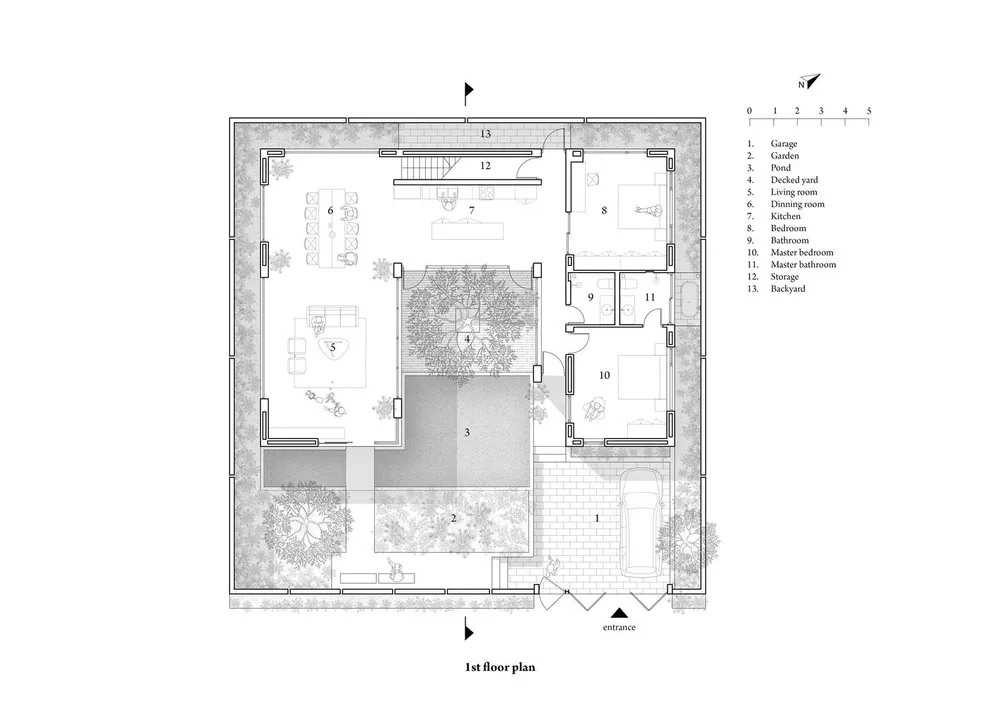 Từ mọi vị trí trong nhà, mọi người có thể nhìn thấy nhau và nhìn thấy cây cối, mặt nước, hồ cá… |