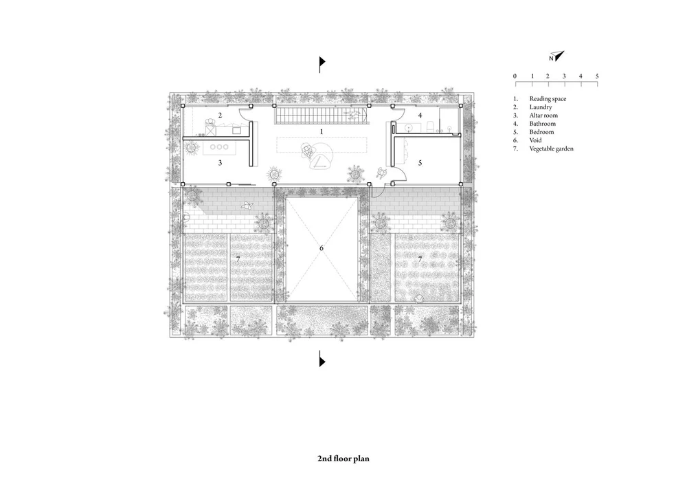 Các không gian chính được bố trí xung quanh một sân trong ở giữa ngôi nhà. |