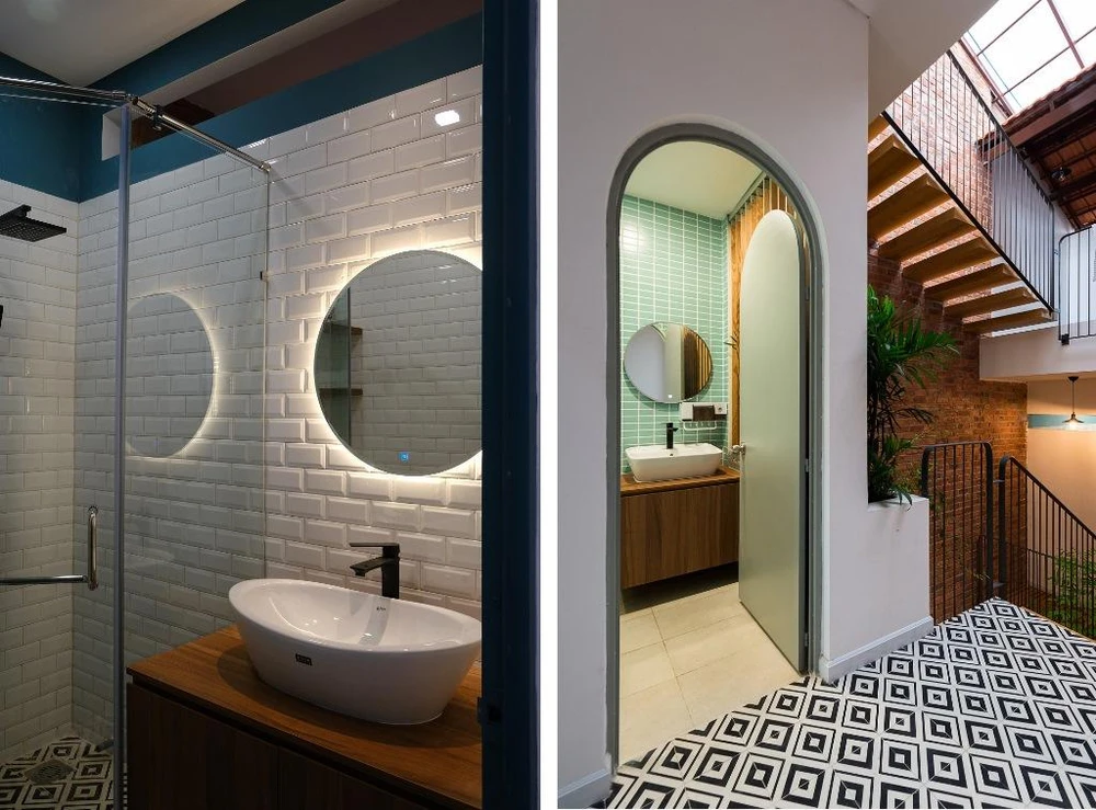 Bậc thang gỗ với kết cấu thép, hành lang trước phòng bằng lam gỗ. Kiến trúc sư sử dụng mảng gạch đỏ cho toàn bộ tường khu vực thông tầng.