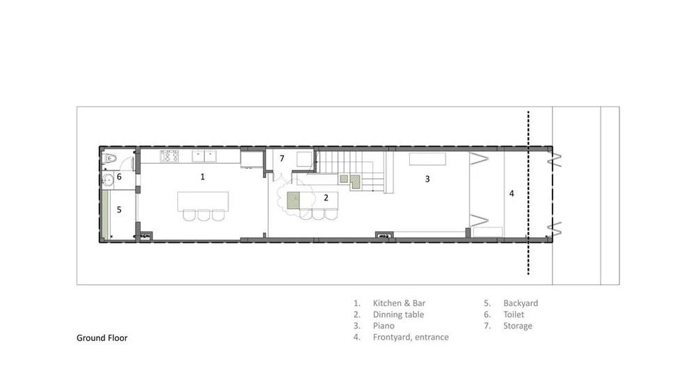 Tầng trệt bắt đầu với sảnh đệm vào nhà, không gian đặt đàn piano, không gian chính là bếp, bar phía sau nhà, bàn ăn được đặt tại giữa giếng trời.