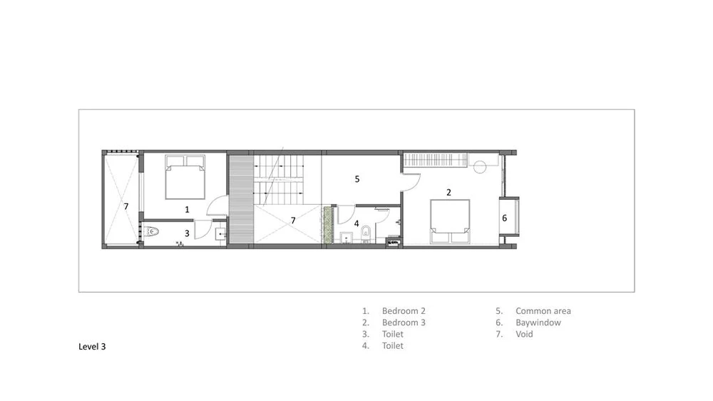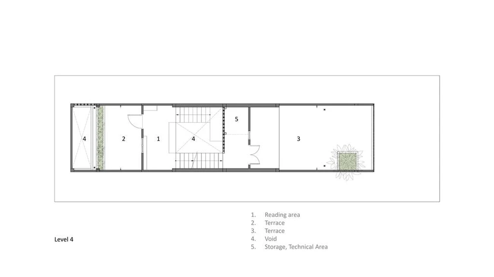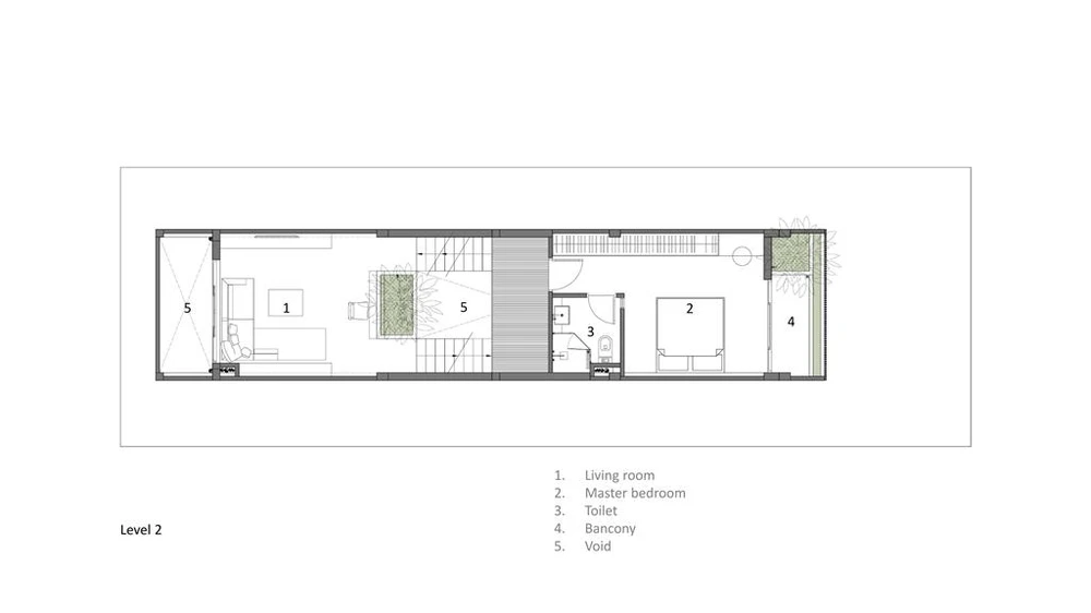 Tất cả các không gian chức năng trong nhà đều tiếp xúc thông thoáng tự nhiên, thông gió, ánh sáng và tiếp cận cây xanh.