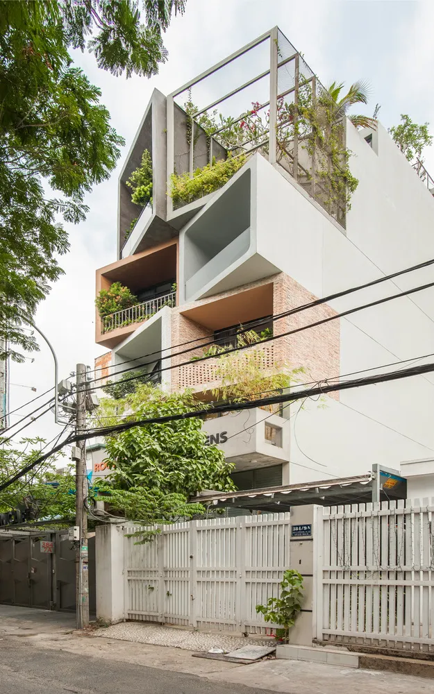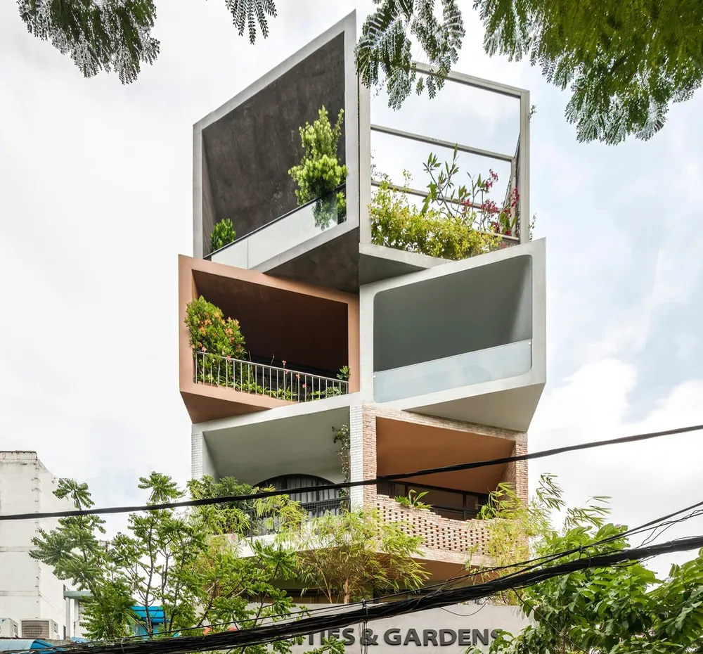 Mặt tiền bao gồm một loạt các khối góc cạnh, mỗi khối được hoàn thành với một thiết kế đặc biệt để thể hiện sự đa dạng và cá tính.