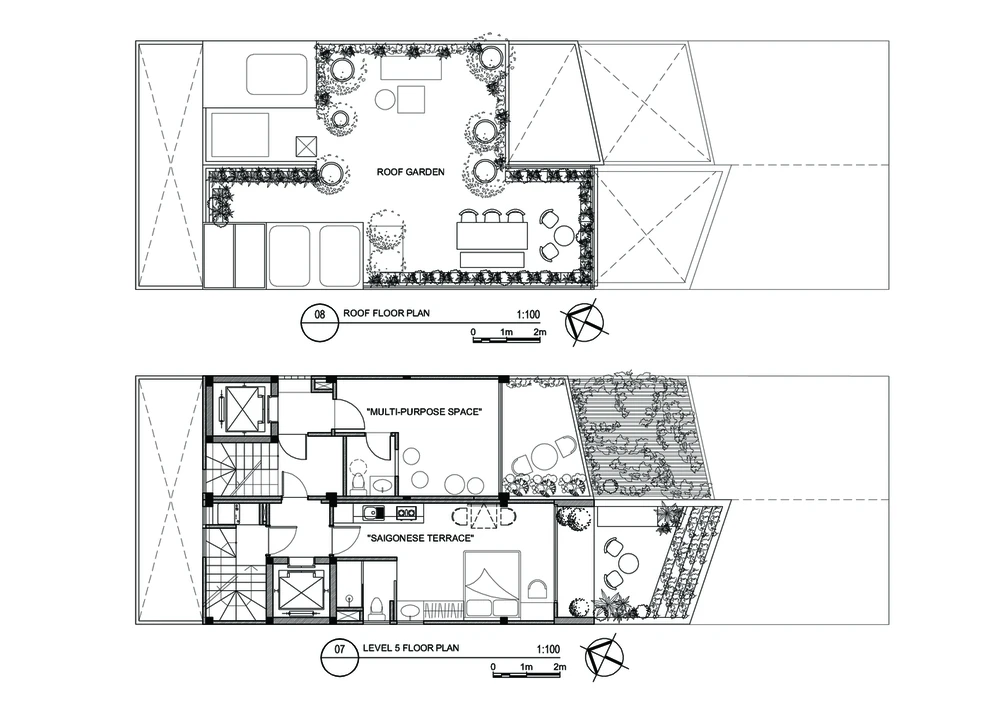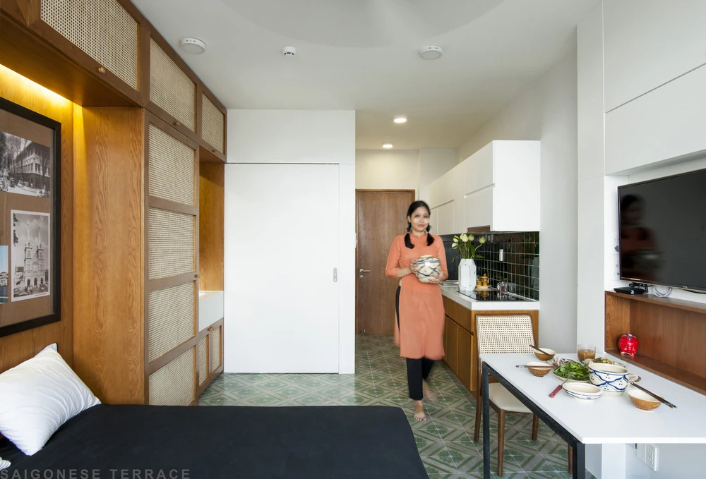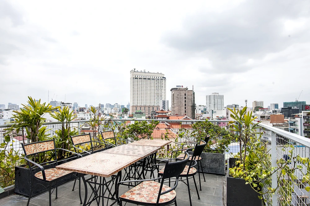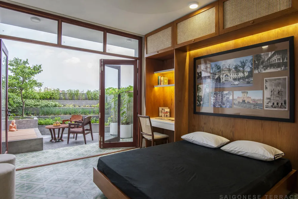 Sân thượng Sài Gòn trên tầng cao nhất được hoàn thiện với các vật liệu truyền thống và địa phương như gạch xi măng, màn hình tre, terrazzo trắng.