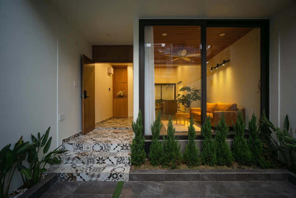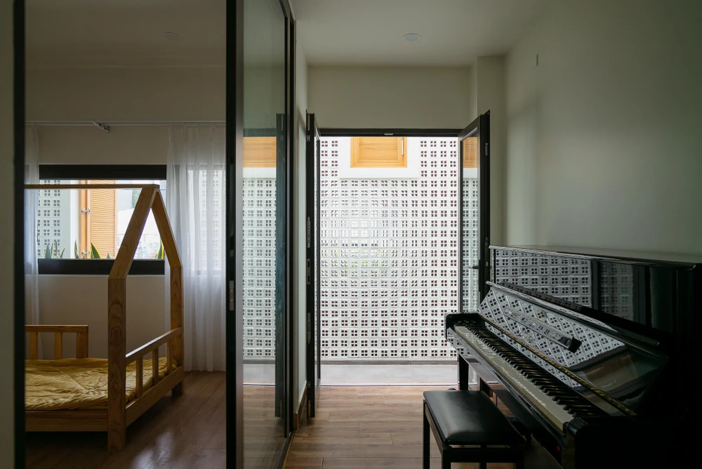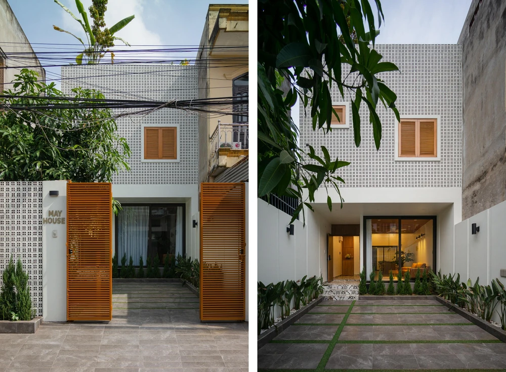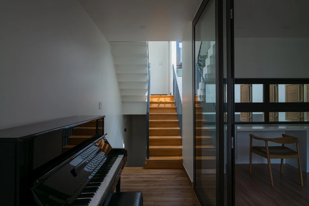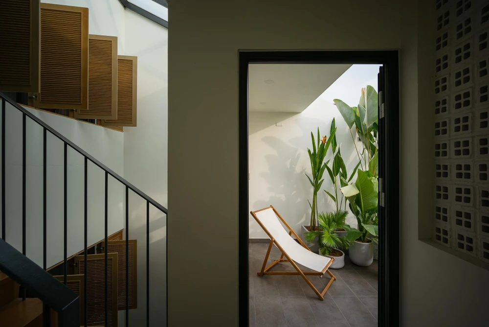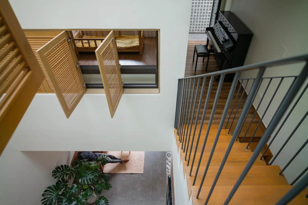 Mặt tiền nhà kết hợp với những ô cửa sổ lá sách tạo sự kín đáo cần thiết nhưng vẫn đảm bảo thông gió tự nhiên và góc nhìn từ trong ra ngoài.
