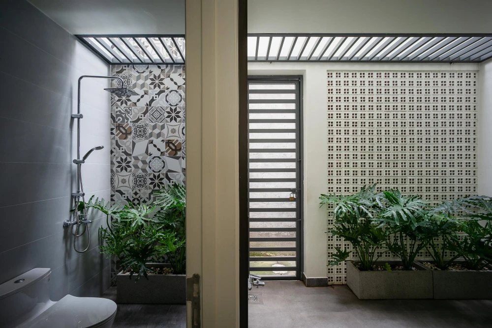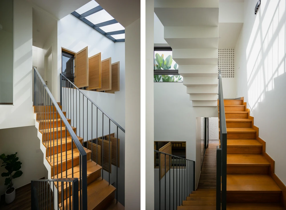Giải pháp trên giúp ngôi nhà được đối lưu gió tốt, các phòng đều có hai mặt tiếp giáp với thiên nhiên.