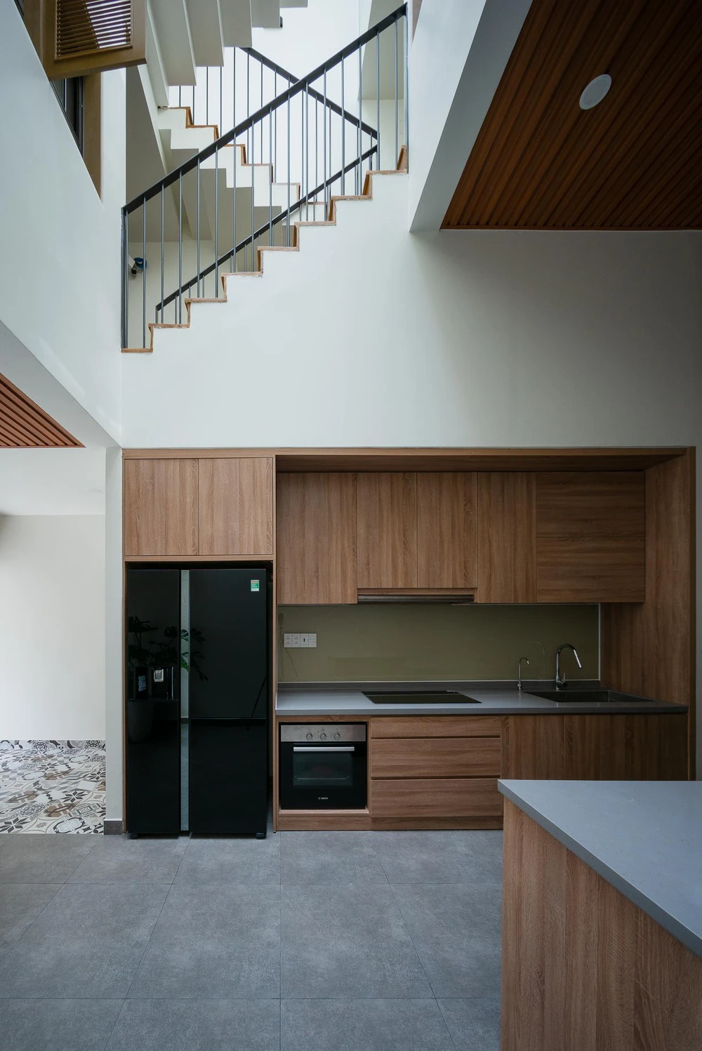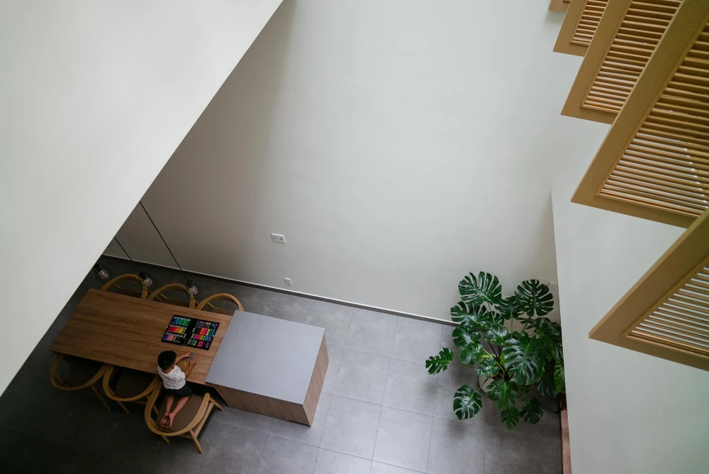 Không gian bếp ăn được nâng cao nhằm đáp ứng nhu cầu tụ họp đông người, đồng thời giúp cha mẹ dễ dàng quan sát con cái ở phòng ngủ phía trên.