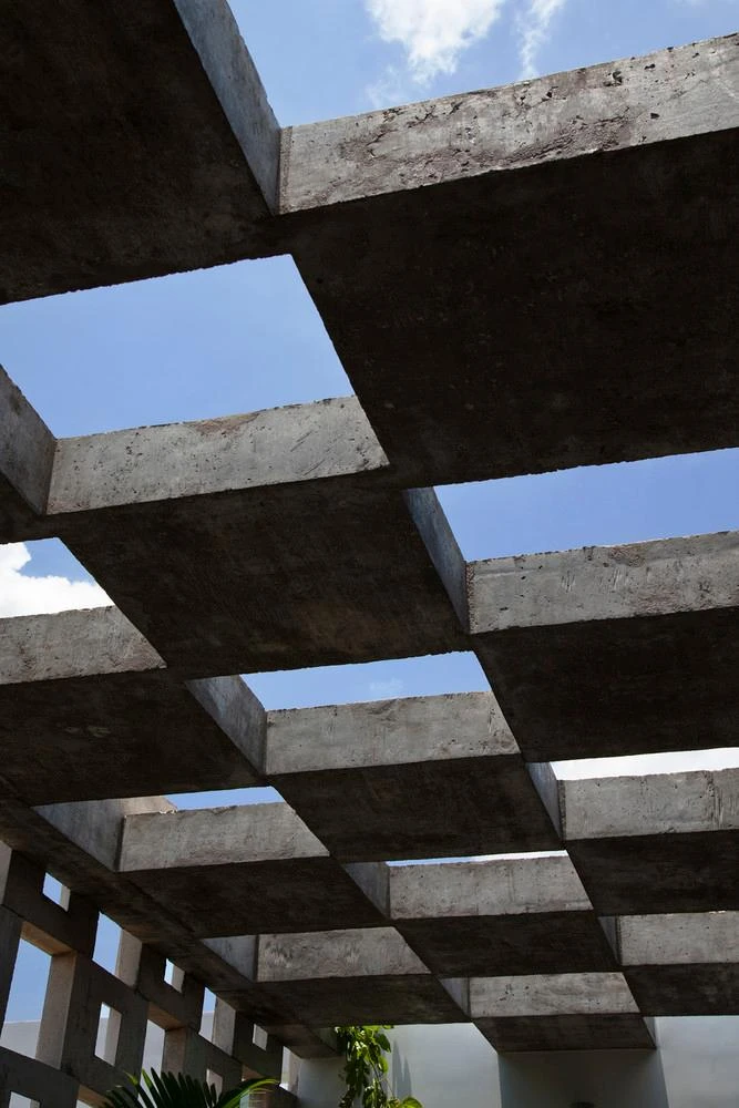 Không gian cho lối sống hiện đại được phân bổ thành ba khối nổi bao bọc bởi các khối hoa văn bê tông.
