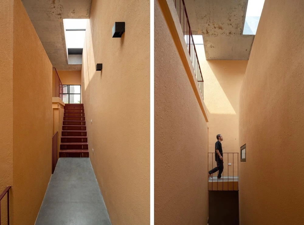 Màu tường vàng nổi bật trên nền hành lang lát gạch màu xám. |