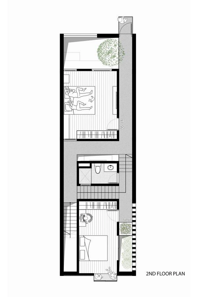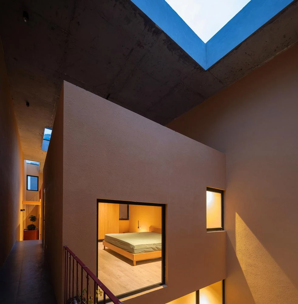 Cũng như các không gian khác, phòng ngủ chủ yếu lấy sáng từ giếng trời và ô cửa sổ lớn. |