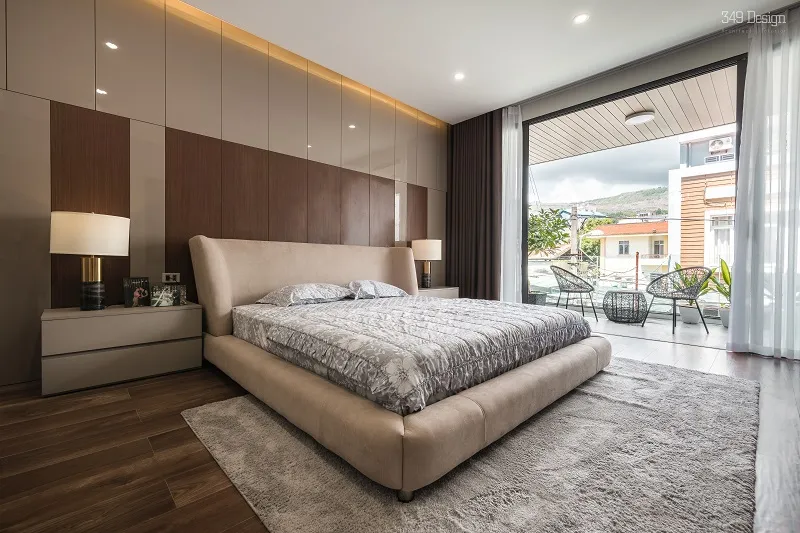 Tầng hai với ba phòng ngủ trong đó có một phòng master được thiết kế chuẩn sang trọng và tối giản, view kính rộng ra ban công. hai hệ tủ quần áo trong phòng được bố trí âm tường tạo cảm giác phòng vẫn vuông thành sắc cạnh sẽ làm tăng thêm diện tích sử dụng cho chủ nhà.