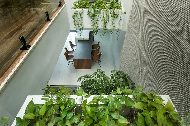 Nhờ vậy, ánh sáng, gió luôn đối lưu và len lỏi tới từng ngóc ngách các phòng trong ngôi nhà. Khoảng thông giữu các tầng mà tại vị trí các phòng ngủ ở tầng hai chủ nhà có thể nhìn xuống không gian tầng 1 khá rõ ràng.
