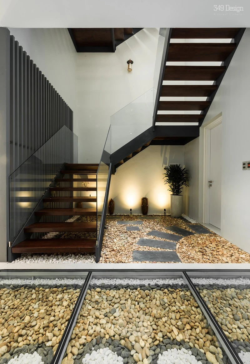 Điểm nhấn cầu thang không tay vịn, bên dưới là lớp sỏi đá được sắp xếp theo kiểu hoa văn.
