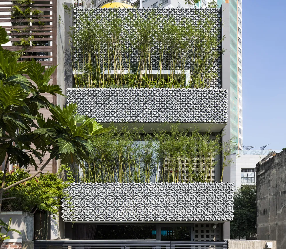Khu vực ban công ở mặt trước các tầng được tận dụng để trồng thêm trúc nhật, vừa có tác dụng điều chỉnh lượng ánh sáng, vừa giúp che chắn.