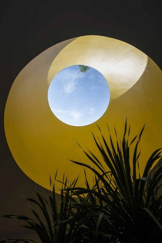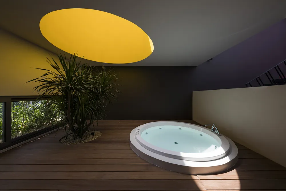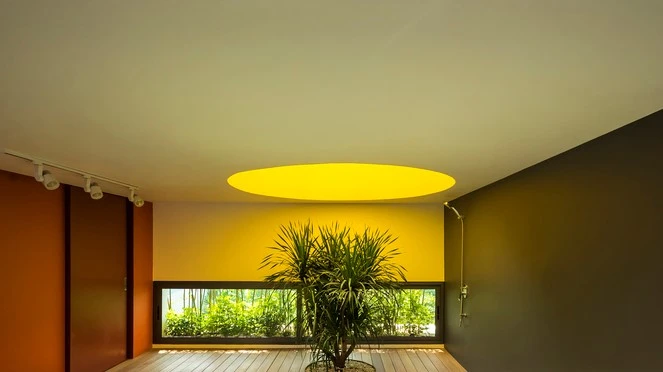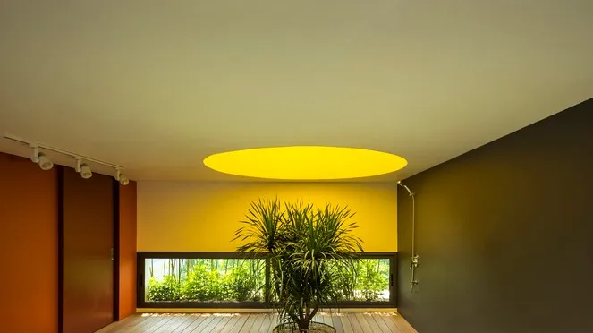 Ở giữa phòng có một giếng trời hình tròn giúp đón thêm ánh nắng vào khu vực này, phía dưới giếng trời được bố trí thêm một bục để trồng cây.