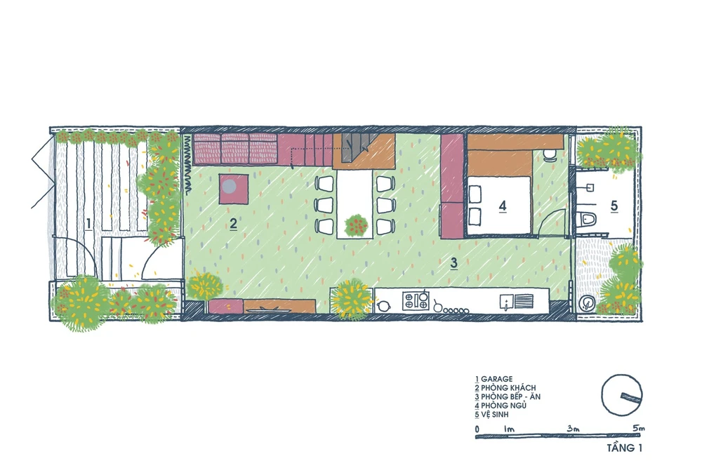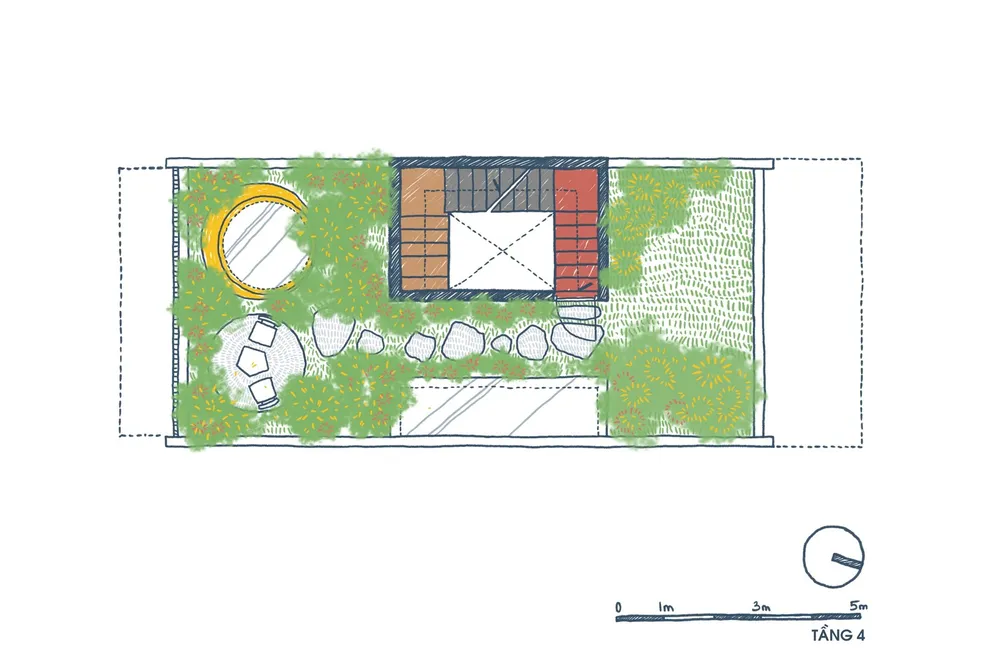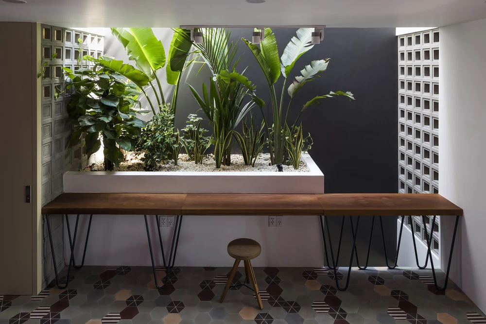 Tầng trệt còn có thêm một phòng ngủ và một nhà vệ sinh nằm phía sau bàn ăn. Các không gian cạnh nhà vệ sinh cũng được kiến trúc sư tận dụng để trồng thêm cây xanh, giúp tăng cảm giác tươi mát cho ngôi nhà.