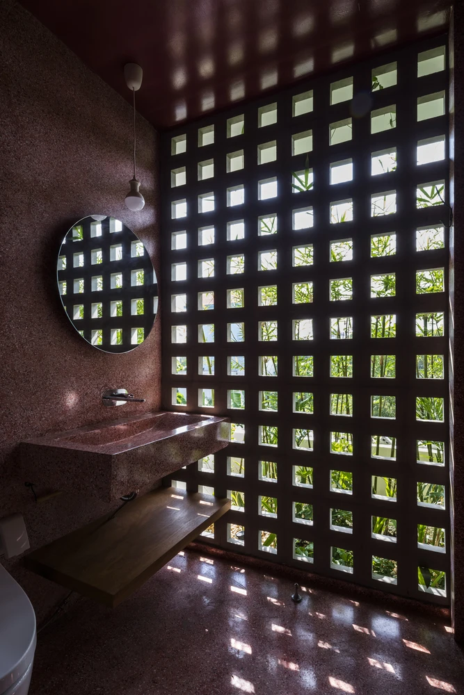 Nhà vệ sinh được lót đá với phần tường hướng ra ngoài bằng gạch thông gió. Bên ngoài ban công sẽ được trồng thêm trúc Nhật để đảm bảo sự riêng tư cho không gian này.