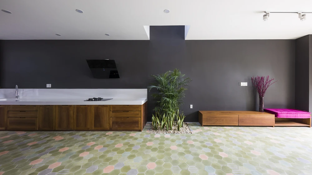 Bếp được bố trí sát tường gần tủ tivi với khoảng không ở giữa được tận dụng để trồng thêm cây xanh.