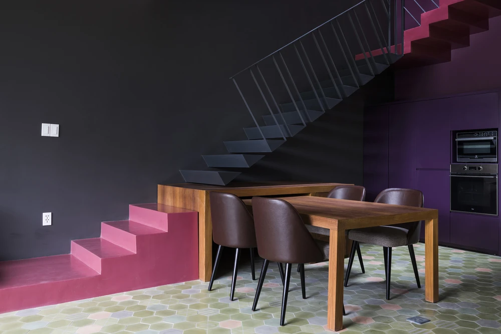 Nhà có tông màu chủ đạo là trắng, đen, tím và hồng. Không gian phòng khách, nhà bếp và phòng ăn xây dựng theo lối không gian mở, loại bỏ hết các bức tường ngăn cách.
