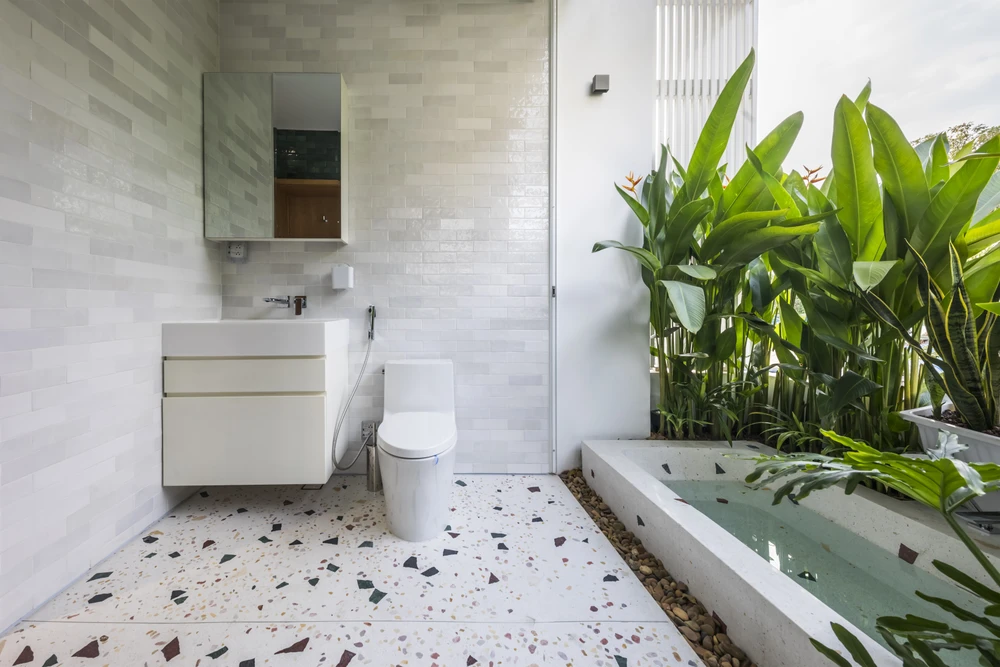 Khu vực bồn tắm được trồng nhiều cây xanh chuối cao để đảm bảo riêng tư. Thiết kế này như mang hơi thở của thiên nhiên giúp tăng sự thư giãn và thoải mái nhất cho gia chủ.