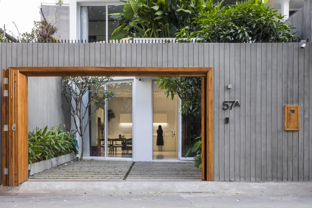 Từ cổng chính vào nhà được chừa một khoảng sân tương đối rộng, sử dụng với mục đích làm khu vực gara để xe. Sân nhà còn là những mảng tường trồng nhiều loại cây xanh mướt giúp mang tính thẩm mỹ cao.