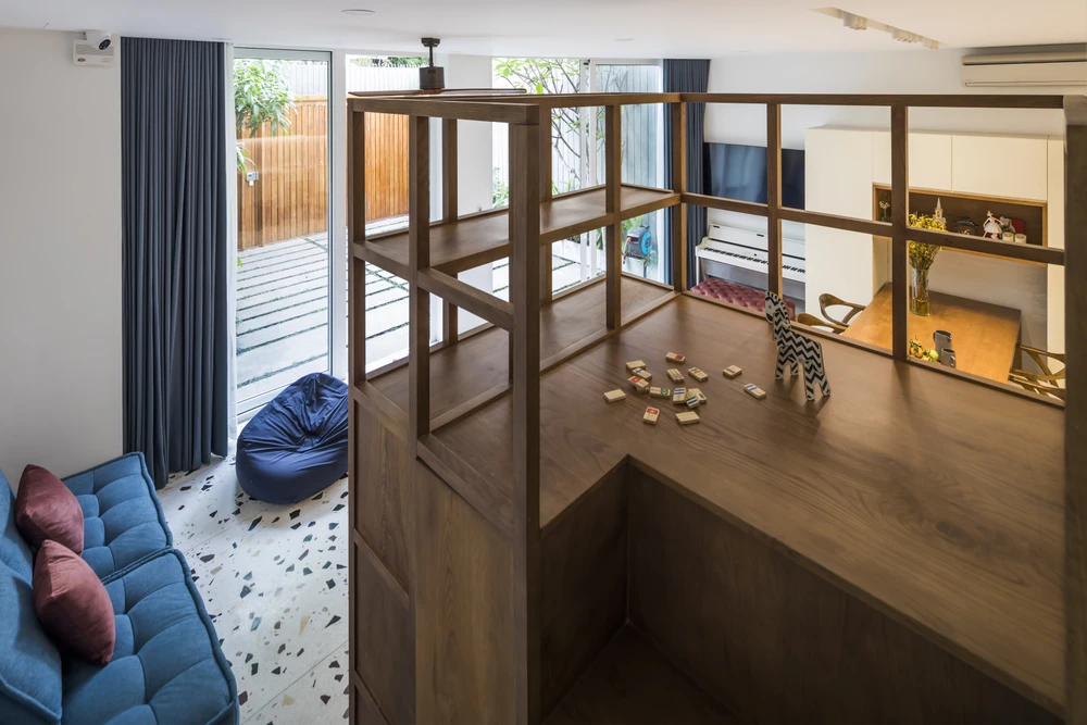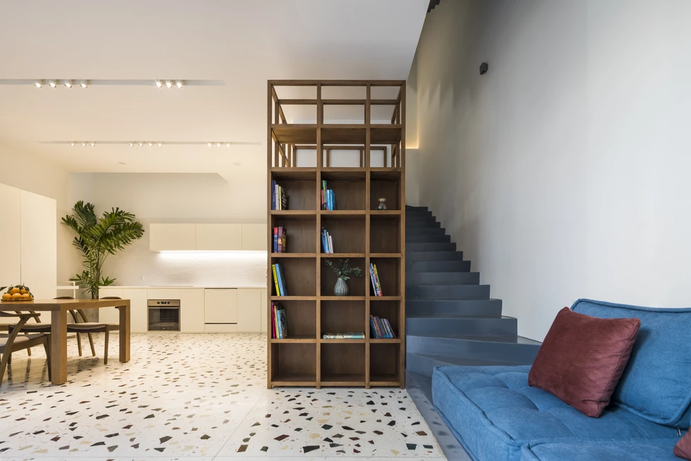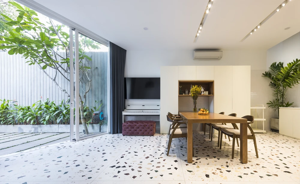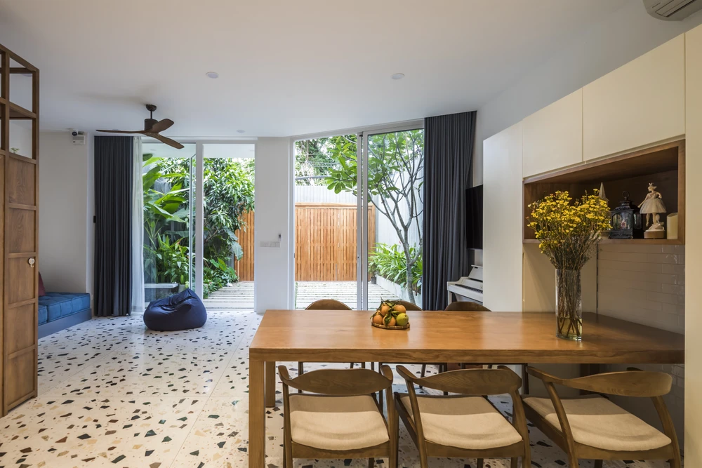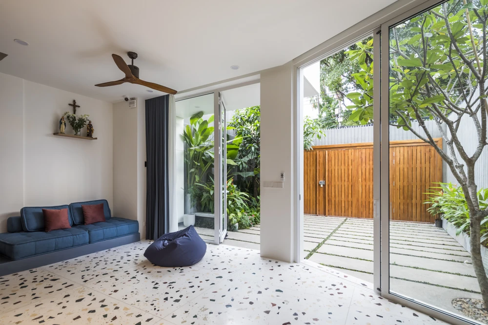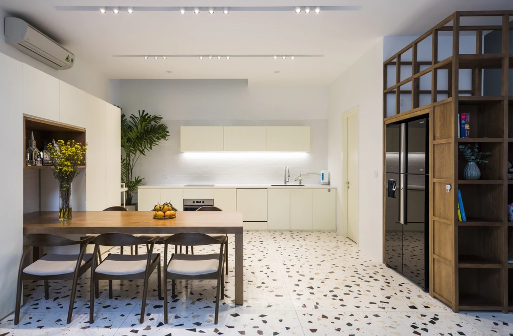 Tường nhà được sử dụng tone màu trắng kem giúp cho không gian nhà thêm thông thoáng. Nền nhà được làm từ gạch terrazzo đá mài, là điểm nhấn độc đáo giúp cho ngôi nhà không bị nhàm chán.