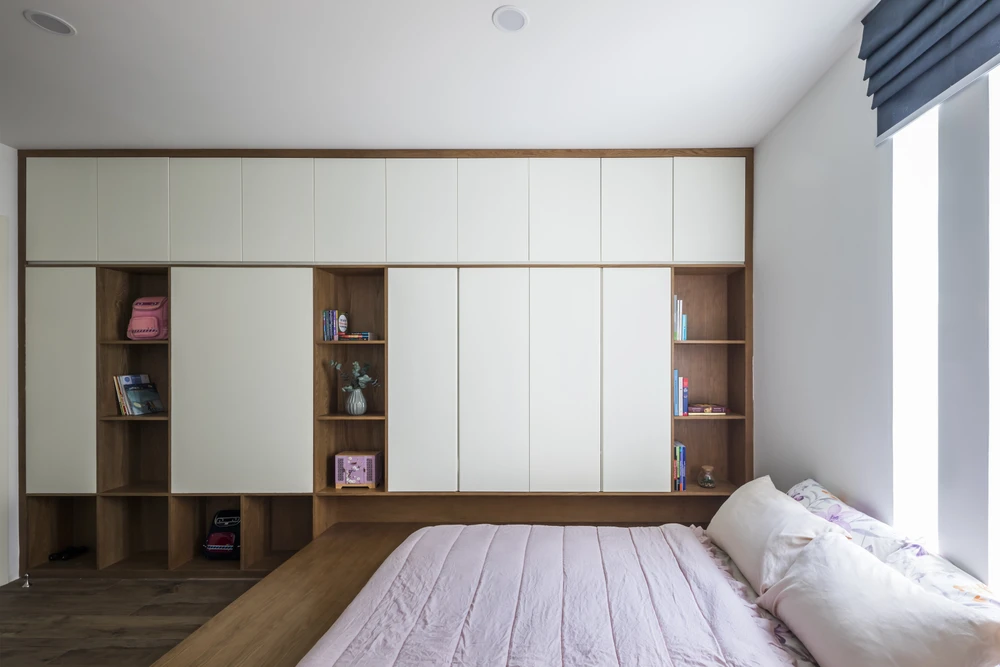 Tầng một thiết kế với hai phòng ngủ nhỏ dành cho trẻ em. Mỗi phòng đều được sắp đặt giường và chiếc bàn dài phục vụ cho nhu cầu học tập. Ngoài ra, hệ tủ kệ kín trần nhiều ngăn giúp cho việc sắp xếp cất trữ đồ đạc thêm gọn gàng, ngăn nắp.