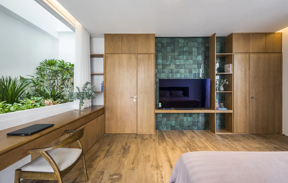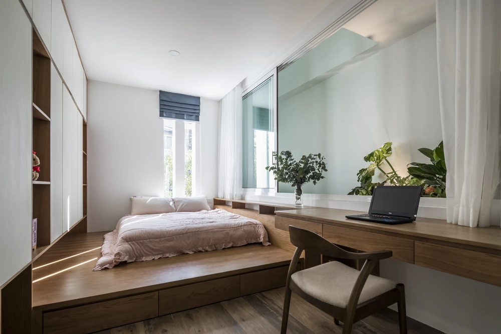 Tầng hai là phòng ngủ master rộng hơn 26 m². Điểm nhấn của không gian này là cửa số giếng trời chiếm trọn tầm nhìn xanh mướt của căn phòng. Chủ nhà sẽ có cảm giác thật sự thư giãn lúc làm việc cũng như nghỉ ngơi.