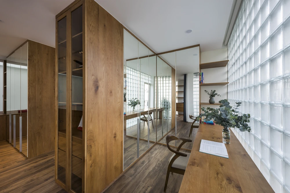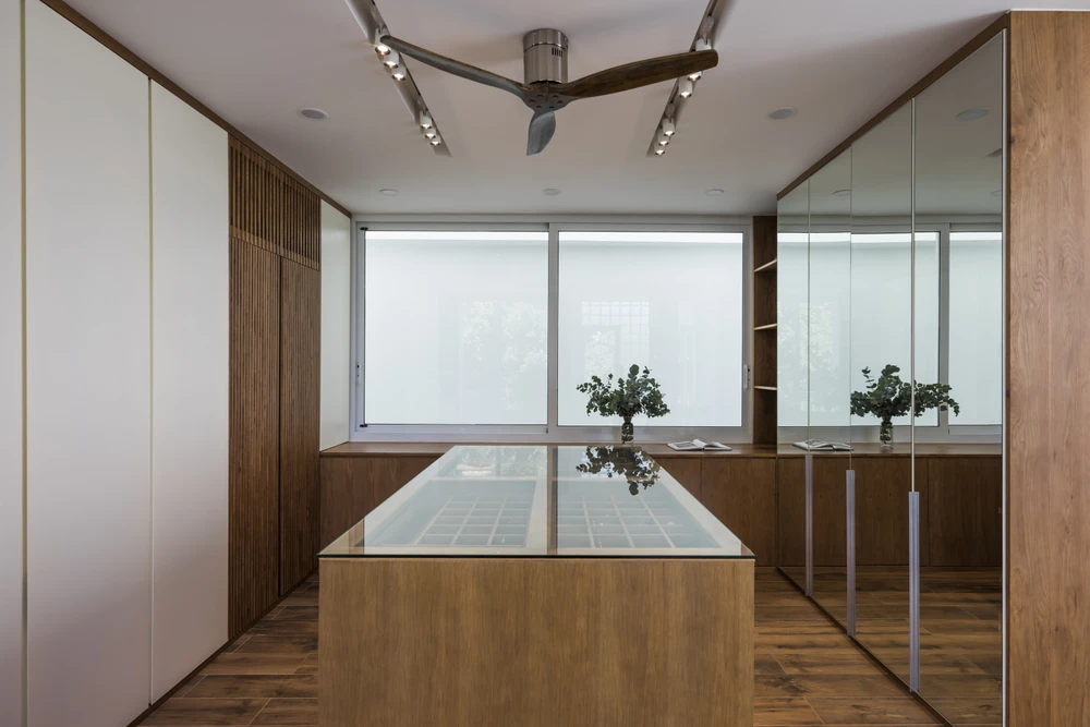 Tầng ba của công trình là khu vực để trưng bày các bộ sưu tập cá nhân như quần áo, các loại túi xách, sách, đồ trang sức… Kiến trúc sư thiết kế hệ tủ kệ sáng tạo, có nhiều mặt kiếng gương mang đến một tầm nhìn thông thoáng hơn cho căn phòng.