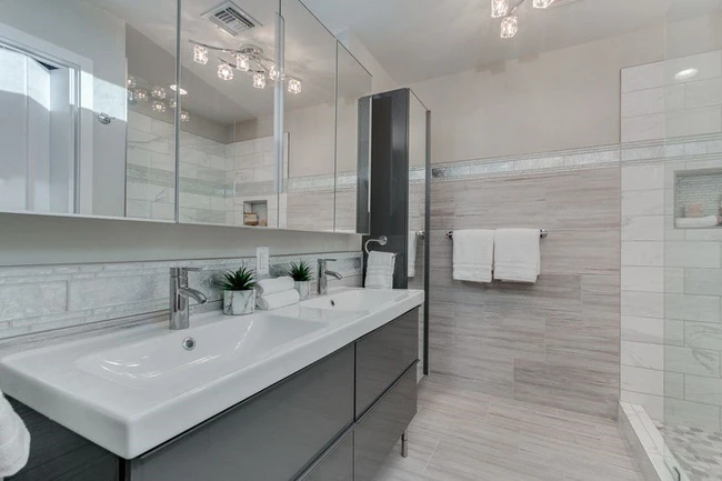 Còn phòng tắm thì quá xuất sắc với lối thiết kế gọn, sạch, bắt mắt và sang trọng. Một tấm gương lớn ở trên tạo không gian rộng thoáng.