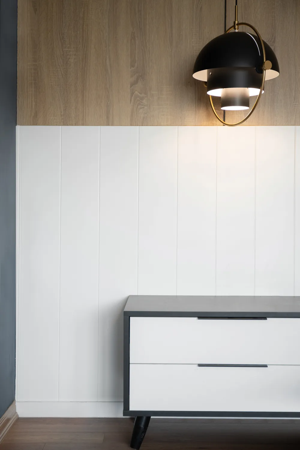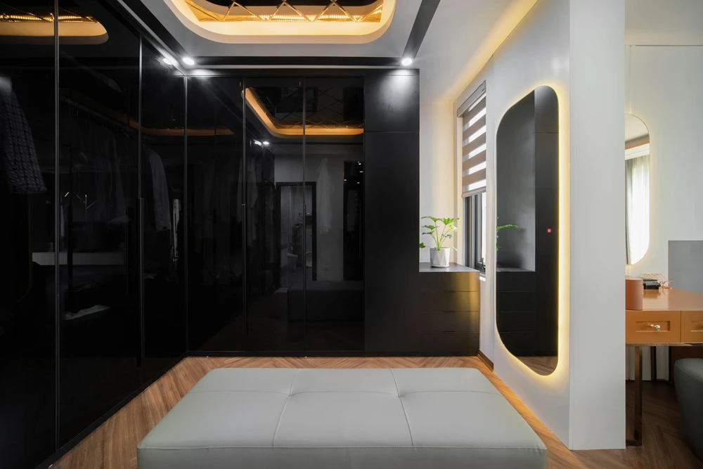 Khu vực thay đồ lắp hệ tủ tông đen sang trọng, có thêm gương gắn đèn vàng hiện đại.